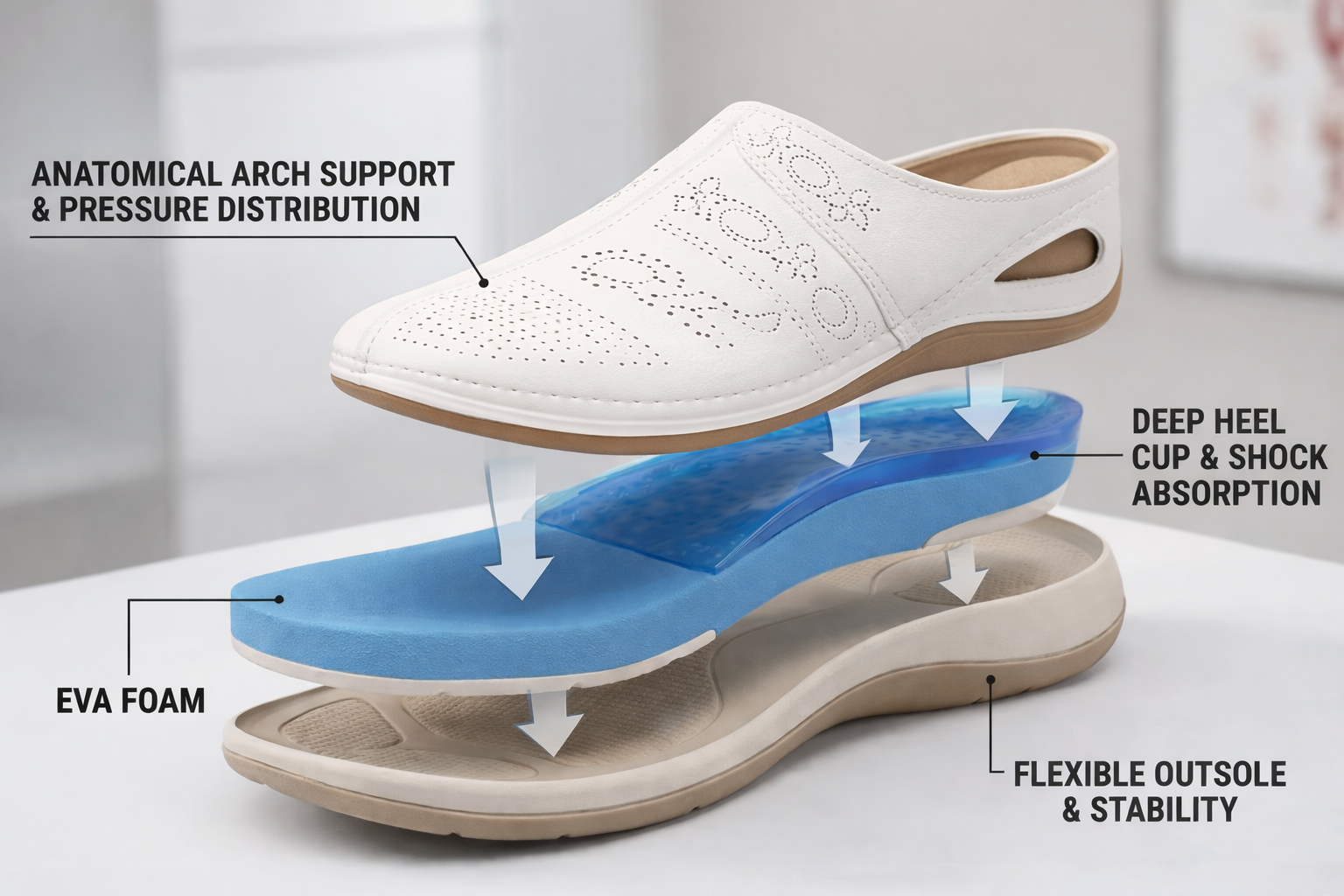- ArchComforting- Thecupped grooves slightly raise the heel to protect the ball of the foot and fit the arch to reduce pressure.